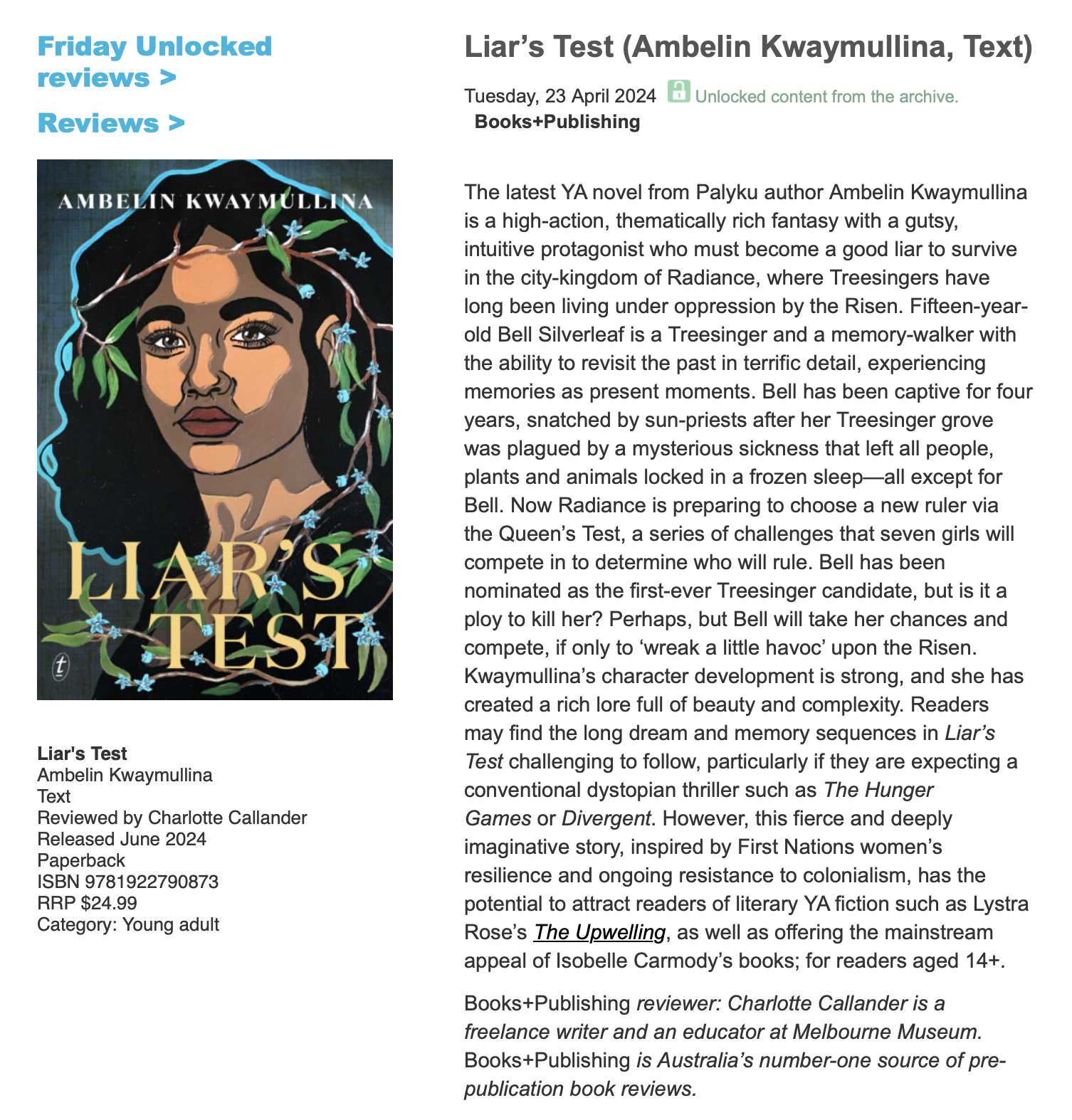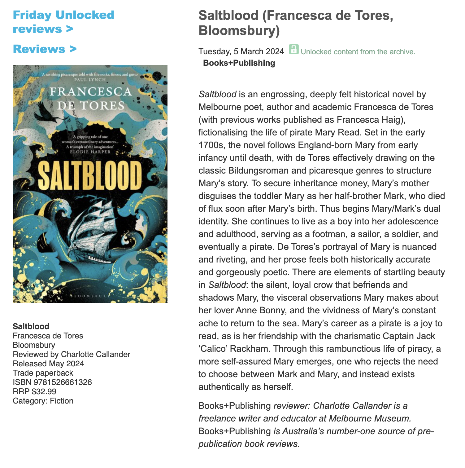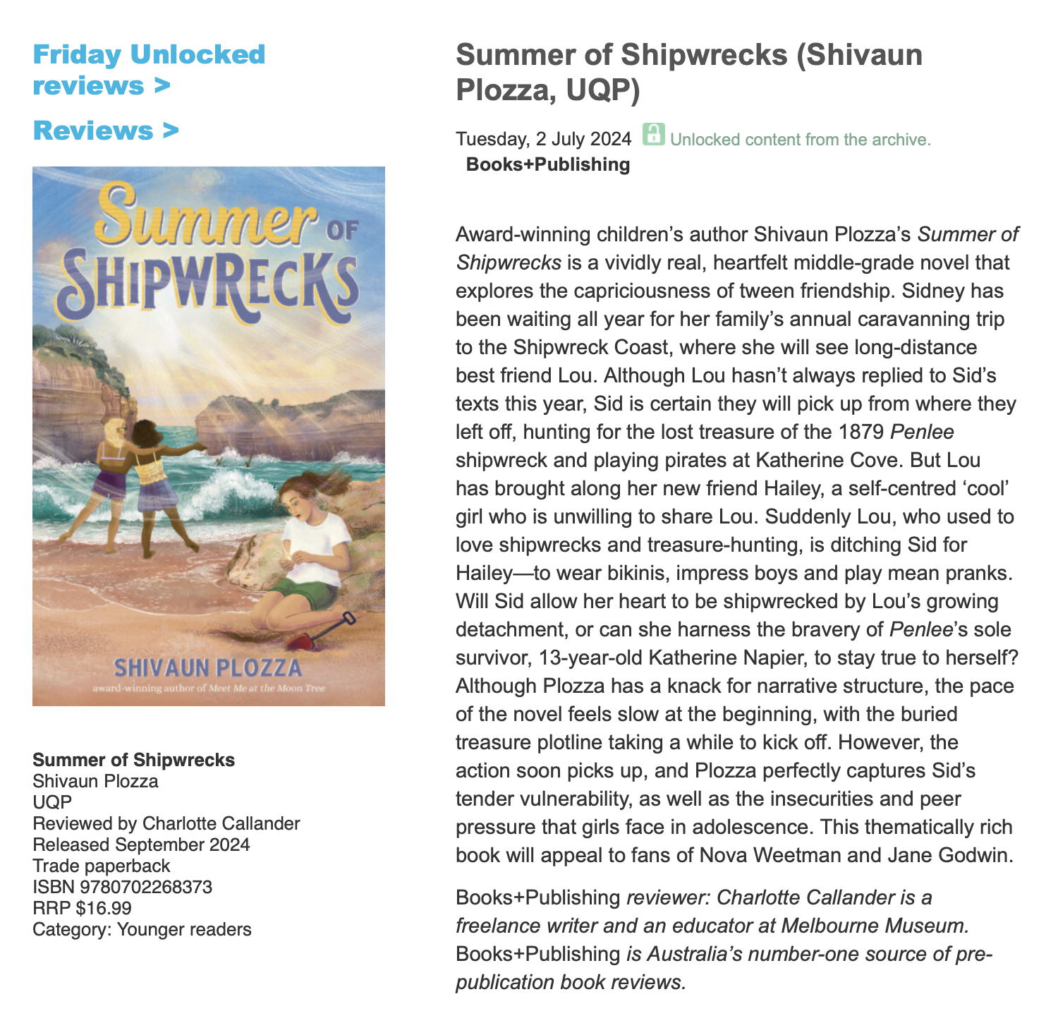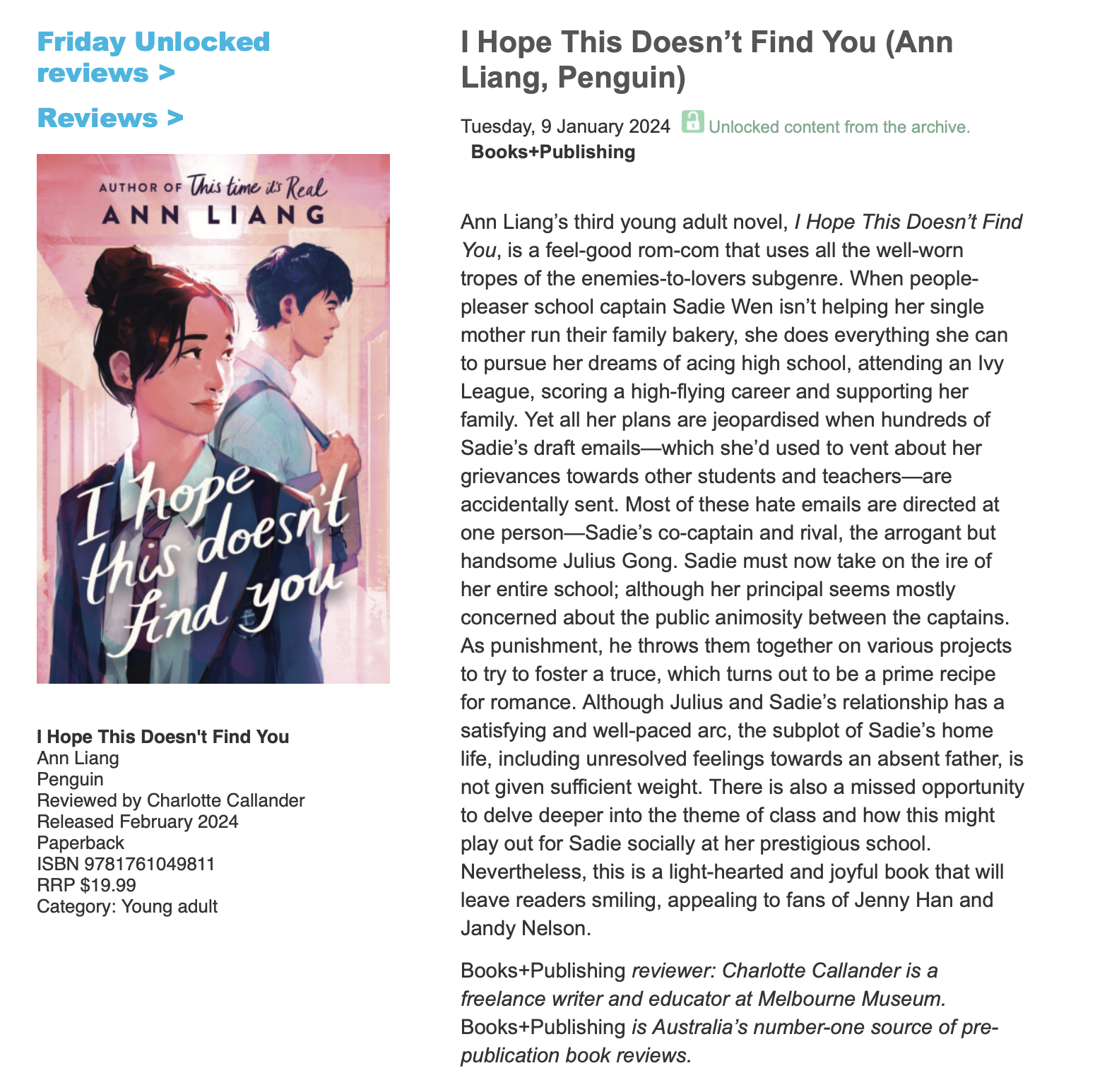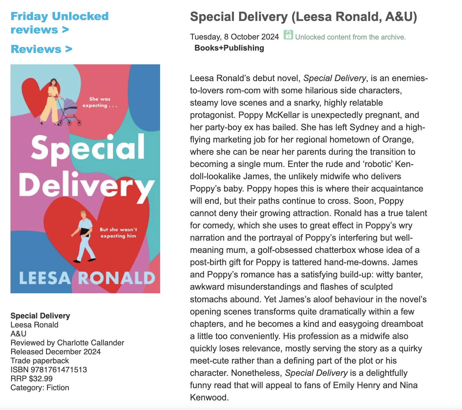 I regularly contribute pre-publication book reviews—usually adult fiction and children’s literature—for the Books+Publishing website, along with occasional author Q&As.